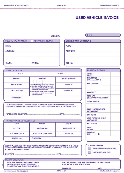 Clearly laid out invoice specifically for Used Cars.